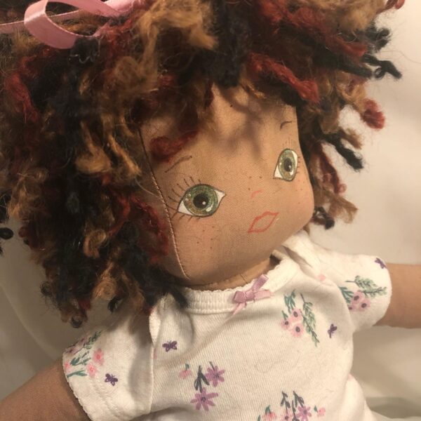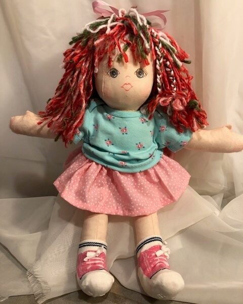 Heirloom dolls are each handcrafted and one-of-a-kind. I’ve made custom dolls with hair and eye color similar to the child who will be receiving the doll as a gift. Clothing can be a favorite color or style, often incorporating T-shirts made from newborn onesies. I love repurposing clothing to dress a doll. Sometimes the dolls are designed to resemble a favorite animated character.