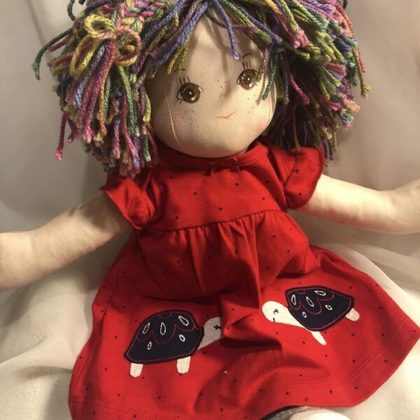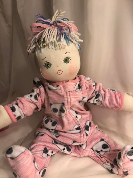 Each doll and stuffy is handcrafted and made to last through all of the loving and carrying around it may experience. Doll clothing is removable. Faces are hand-painted with waterproof fabric paint. Hair is hand-stitched to the head. Arms, legs, and head are securely attached. Filling is flame-retardant.